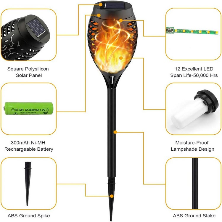 چراغ مشعلی خورشیدی فوقالعاده زیبا بدون نیاز به هیچگونه منبع خارجی .دارای باتری لیتیومی داخلی و چراغهای LED مناسب جهت باغ و پیاده رو