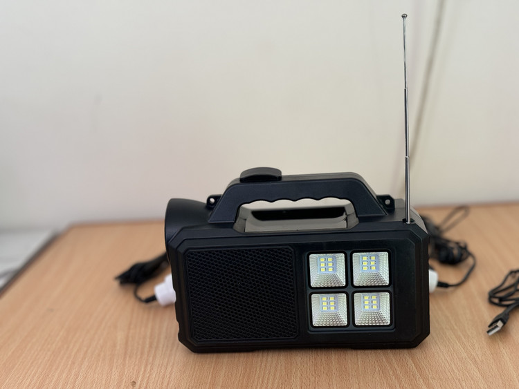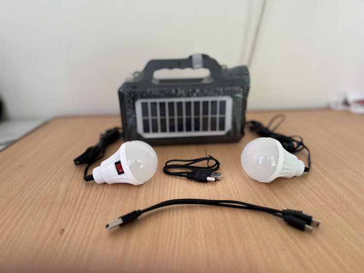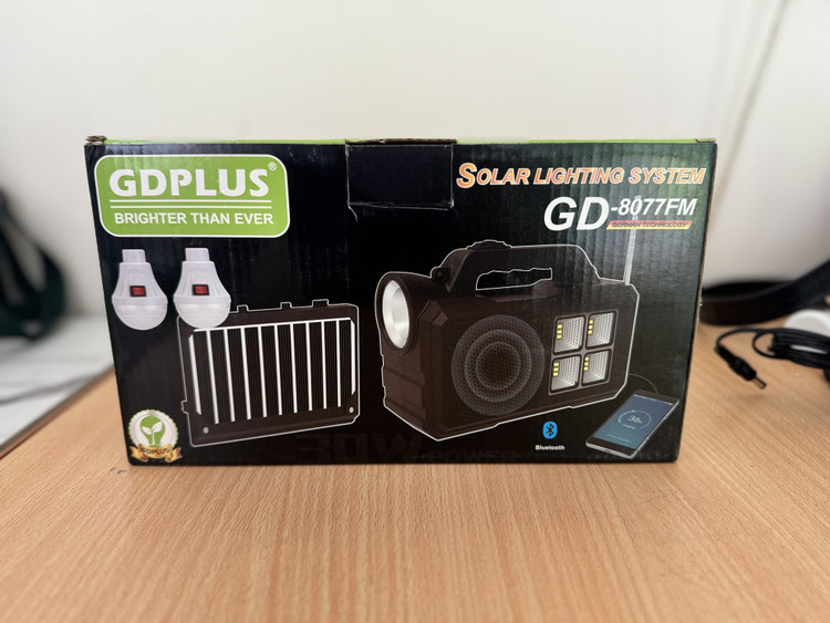 بهره برداری از انرژی های نو و پاک روز به روز در حال افزایش است که خود موجب بهتر شدن شرایط زیست در کره زمین می شود . یکی از این گونه های انرژی پاک ، انرژی خورشیدی است که به دو روش تولید می شود که یکی در نیروگاههای حرارتی خورشیدی و دومین روش ، تولید برق در نیروگاه های با پنل های خورشیدی می باشد . در ابعاد کوچکتر می توان از این انرژی با پنل خورشیدی بهره گرفته و انرژی الکتریکی تولید شده را در باتری های شارژی ذخیره کرد و به هنگام نیاز ، از آن بهره گرفت . سیستم خورشیدی GDPLUS مدل GD-8077FM یکی از این دستگاهها است که از تکنولوژی آلمانی بهره میبرد. دستگاه اصلی با 2 منبع روشنایی بر روی خود که یک عدد بصورت چراغ قوه LED در مقابل و یک منبع بصورت LED چهار عددی در قسمت جانبی آن قرار دارد ، تشکیل شده است .قابلیت اتصال با بلوتوث به گوشی همراه را دارد. پنل خورشیدی روی خود دستگاه قرار دارد که این امر موجب حمل راحت آن میشود همچنین قابلیت اتصال پنل بیرونی 5 ولت دارد. 2 عدد لامپ ال ای دی با سیم بلند4 متری و کلید ، در جعبه دستگاه قرار دارد که با اتصال به دستگاه اصلی می توان از روشنایی آن برخوردار شد البته دستگاه قابلیت اتصال 3 عدد لامپ را دارد . در پشت دستگاه یک پورت USB قرار دارد که می توان به کمک آن موبایل را شارژ کرده و بعنوان پاور بانک از آن بهره گرفت که قابلیت شارژآیفون رو هم داره . کابل شارژ چند کاره نیز در جعبه قرار دارد تا بتوان بیشتر دستگاههای مبایل رو شارژ کرد . با ورودی پنل خورشیدی DC 5V میتوان شارژ را انجام داد که حدود 8 تا 10 ساعت طول میکشد.باتری داخلی 3.7 V با 4000 MAH دارد.چراغ LED مقابل 150LM و چراغهای LED کناری 500LM میباشد.